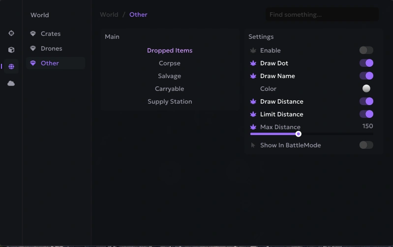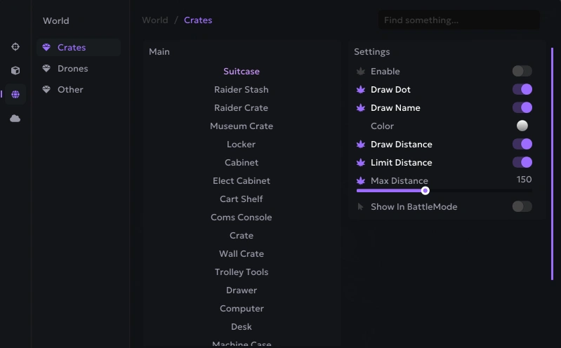 - Crates (Enable, Draw Dot/Name/Color/Distance, Limit Distance, Max Distance, Show In BattleMode)