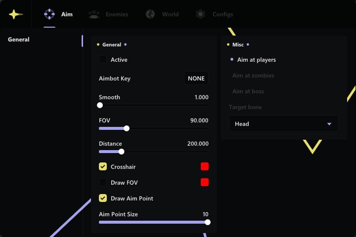 - Advanced Aimbot: Precision locking for Players, Zombies, and Bosses with a custom FOV and crosshair overlay.